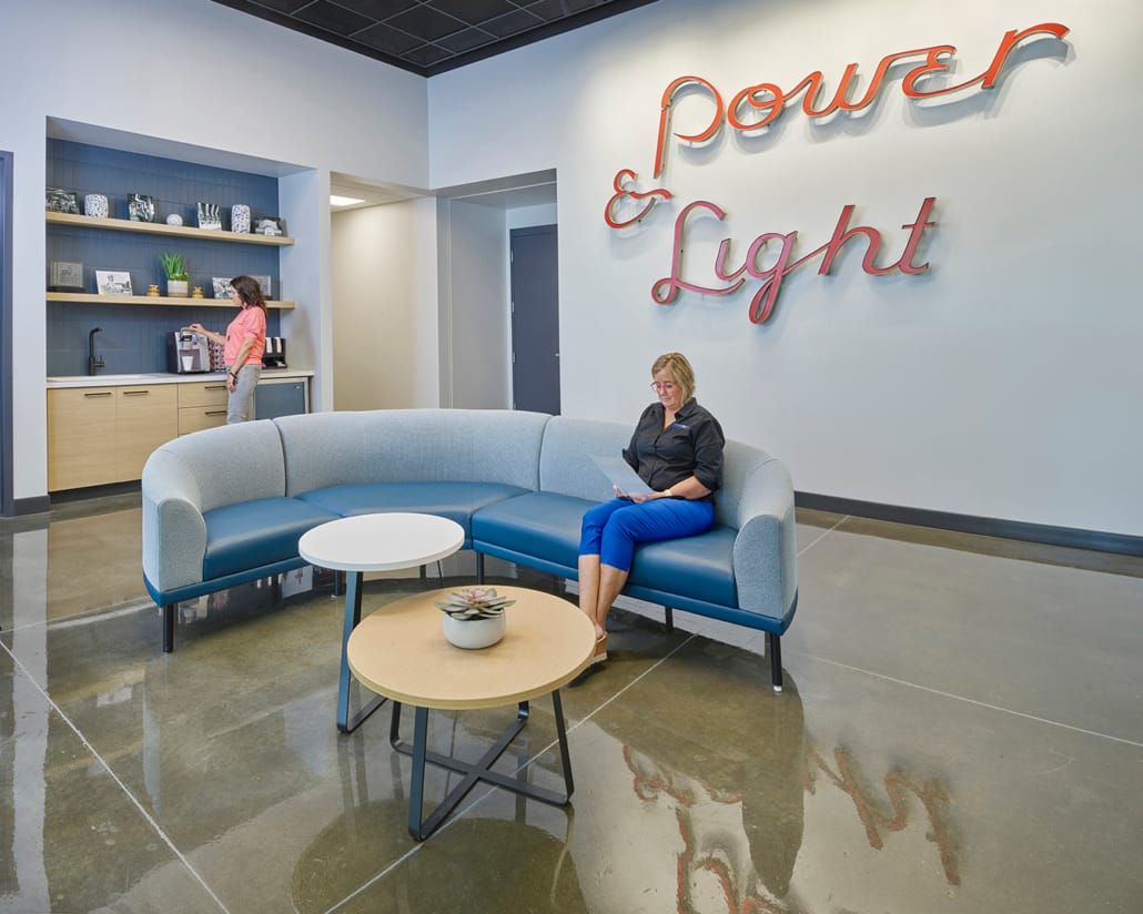 This new 58,000 sq.ft. facility was designed to house all departments for HMPL and to better support their staff and serve the Henderson community. The furnishings tie seamlessly into the industrial backdrop, with warm natural wood tones, greenery and accents of the HMPL “blue.” The entry lobby lounge seating provides a hospitable welcome that flows through into the open collaboration and private meeting spaces. All 20 private offices we designed with user function, efficiency, ergonomics and comfort in mind – all while being fiscally responsible.