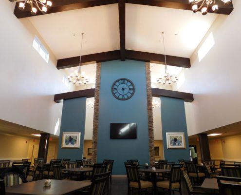 We provided the furniture and flooring for this new 51 suite facility in Henderson, KY. Our computer aided renderings assisted the client in visualizing and marketing their new facility even before it was completed. This project showcases our interior design capabilities to not only select furnishings and accessories, but also in choosing interior elements. The finished product is a casual, but elegant, environment that fits the needs of the client as well as their residents.