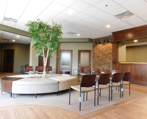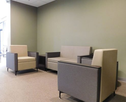 In partnership with local designer, Kip Farmer, we met the client’s vision for creating a calming atmosphere to greet their many patients upon arriving. We were able to compliment Kip’s use of neutral tones, muted lighting and natural elements with a centralized lounge that surrounds a silk tree. This helps to create a welcoming focal point. In addition, we provided soft lounge seating and the individual chairs needed for this busy medical practice.